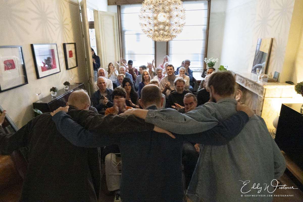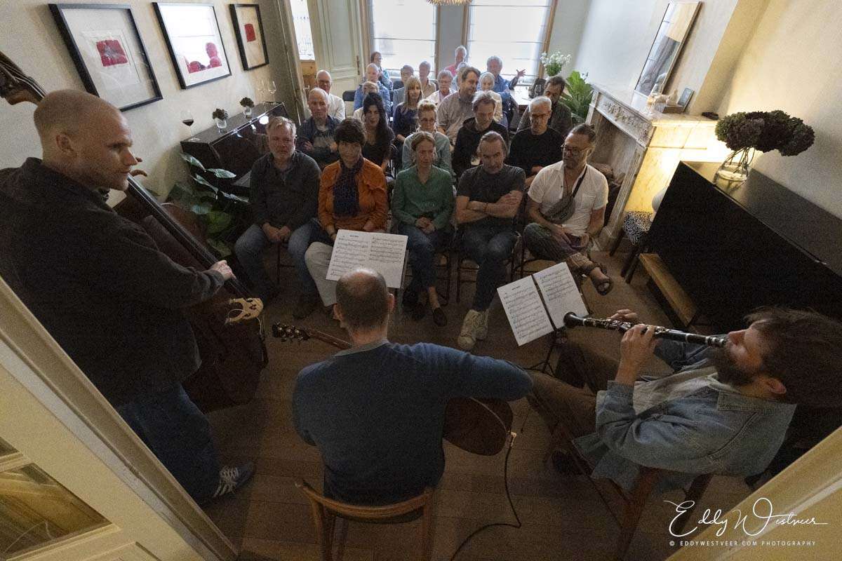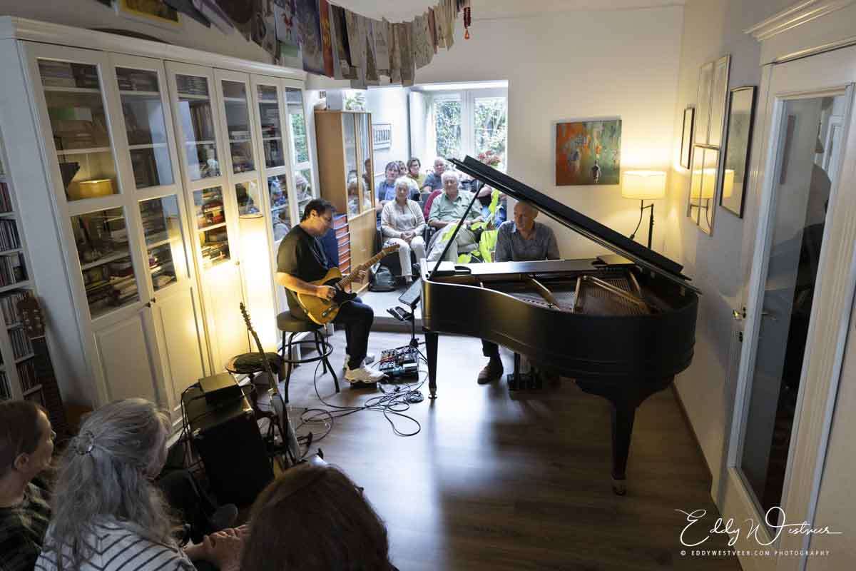 Van de Colomastraat naar de Arsenaalstraat was het maar een korte wandeling. Een sandwichbord en een affiche wezen ons de weg: hier speelde het volgende huiskamerconcert. In de tuin genoten pianist Ivan Paduart en gitarist/mondharmonicaspeler Patrick Deltenre van een korte adempauze na hun eerste set. Binnen stond de vleugel trots opgesteld tussen huiskamer en eetkamer. Met slechts twintig stoelen zat het publiek er letterlijk omheen.