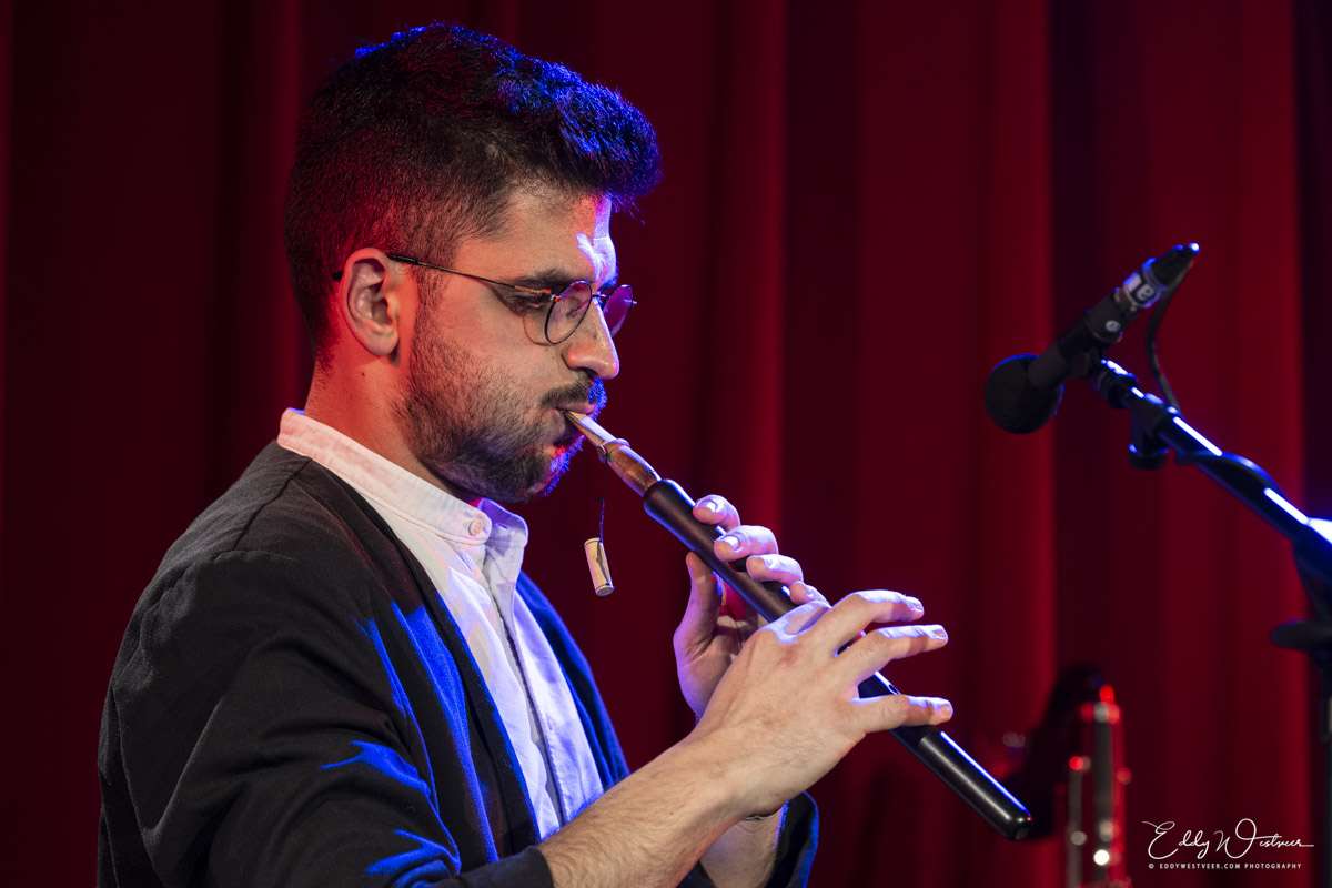 Met Aftab, Perzisch voor zonlicht, verschuift de toon naar iets hoopvollers—al blijft de onderstroom ernstig. Het stuk, geschreven voor de Armeense duduk, ontstond rond Nowruz (Perzische nieuwjaar en lentefeest geldt als equivalent voor Moederdag in Syrië), en is opgedragen aan onderdrukte mensen wereldwijd. Landen en conflicten worden expliciet genoemd, en dat maakt de muziek geladen en actueel. In Oh Palm opent Almaghoot met een statige solo op basklarinet, zonder begeleiding, en houdt hij het publiek in een bijna tastbare stilte gevangen. Ook hier bepalen de microtonen de typische melodische bewegingen die de muziek laden met emoties en sfeer. Dan sluipt drummer Erik Larrea binnen met subtiele percussie, waarna het geheel uitgroeit tot een vurige eruptie. Altvioliste Yanna Pelser lijkt ondertussen een heel strijkorkest op te roepen—rijk, gelaagd en meeslepend.