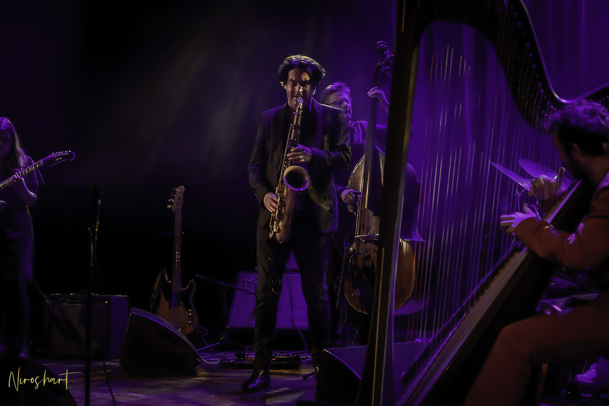 In deze enige set van vanavond worden vooral lang uitgesponnen nummers ge(re)construeerd. Het vijfkoppig ensemble brengt prachtige soundscapes voort. Ieder lid krijgt volledig de ruimte om hier één of meer ingrediënten aan toe te voegen. Ik noem bassist Tony Overwater en zijn aan oriëntaalse invloeden ontleende lijnen en punky basloopjes, Elina Zirina met haar afwisselend getokkel, zwevende akkoordenecho’s en bezielde solo’s en het af en toe intieme, dan weer ondersteunende en soms verpletterende slagwerk van Vroom. Ik noem het afwisselend meditatieve spel en de bijtijds zwaar aangezette harptirades van Van Kesteren en het constante, tomeloze en immer verrassende tenorsaxspel van Honing.