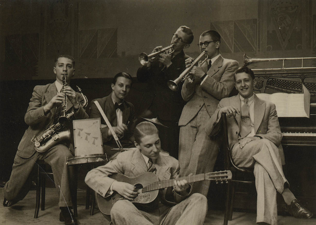 The Tooping Tooters in mei 1937 met v.l.n.r. Rudi Spits (altsax, klarinet), Bas Vaandrager (drums), Ytzen Brusse (gitaar), Kees ? (trompet), Wim Droog (trompet) en Wim Struyk (piano). Trombonist Leo Blok staat niet op de foto