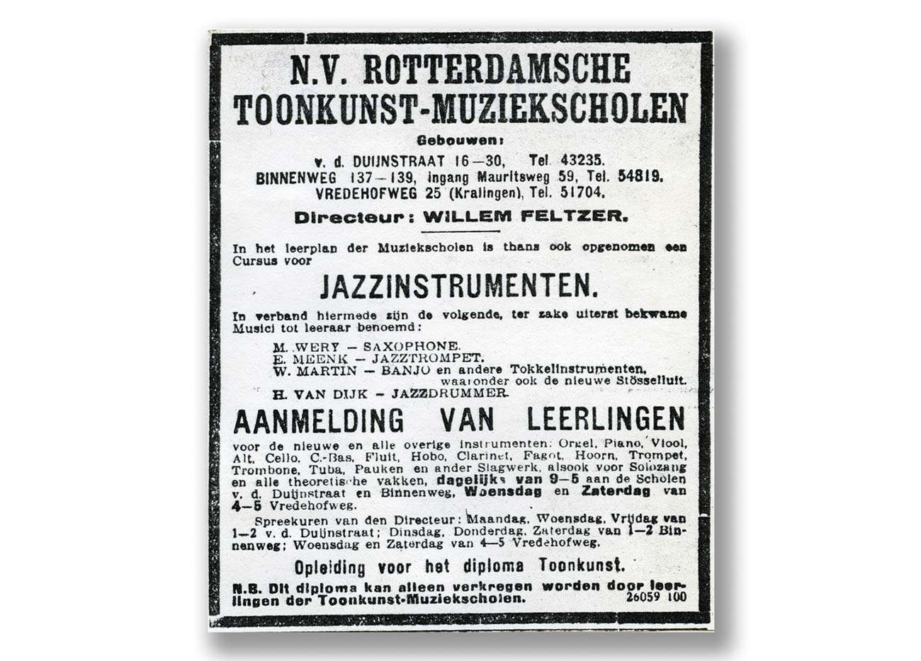 Mede onder invloed van de groeiende populariteit van de radio en de jazzmuziek benoemde Jos Holthaus, die Siegfried Blaauw was opgevolgd als directeur van het Conservatorium, in 1928 Theo Uden Masman als jazzdocent. Toonkunst bleef niet achter. Het Conservatorium van Holthaus telde in 1928 duizend leerlingen en de school van Feltzer iets meer dan achthonderd. Toonkunst startte in april 1929, zoals gezegd, een cursus voor jazzinstrumenten met Meijer Wery (saxofoon), Eddy Meenk (trompet), Willy Martin (banjo en gitaar) en Harry van Dijk (slagwerk) als gezichtsbepalende docenten. ‘Het feit, dat moderne componisten in hun orkestwerken meer en meer gebruik gaan maken van de tengevolge van de ontwikkeling der jazzmuziek ontstane nieuwe effecten vereischt een uitbreiding der techniek in deze richting,’ stond in het Rotterdamsch Nieuwsblad van 10 april 1929.
