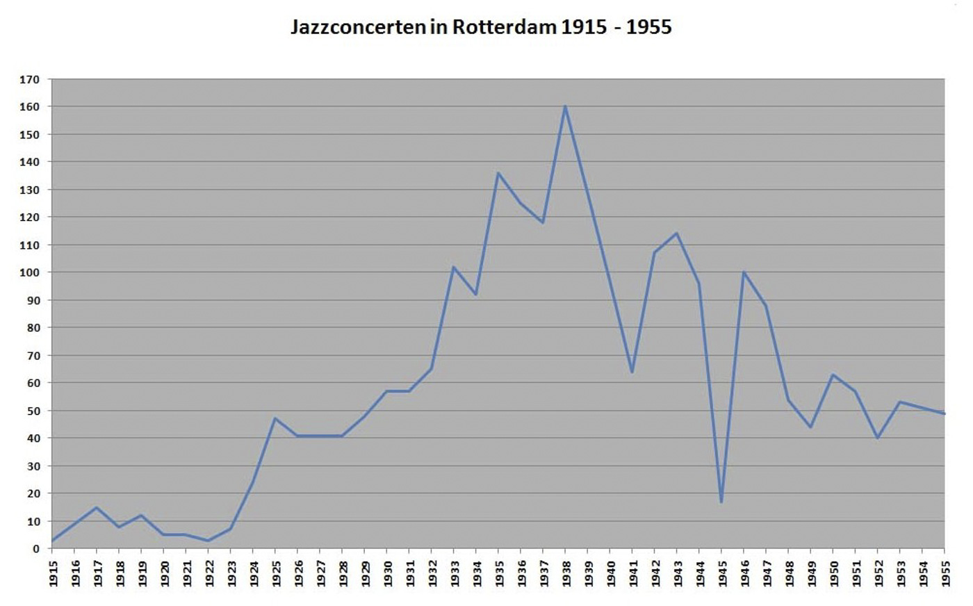 In weerwil van de negatieve en pessimistische recensies in De Jazzwereld groeide het aantal jazzconcerten in de jaren dertig spectaculair. Onderstaande grafiek is gebaseerd op aankondigingen en recensies in de kranten, de vakbladen en het archief van Hans Langeweg. Ragtimeconcerten zijn ook als jazz aangemerkt.